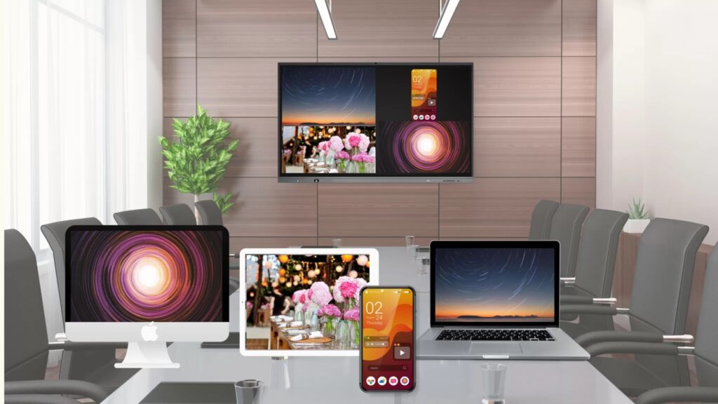 The OPS Module enables wireless screen sharing for Windows laptops, Macs, iOS, and Android devices. With a maximum capacity of 9 devices, it allows seamless mirroring to interactive smart boards simultaneously.